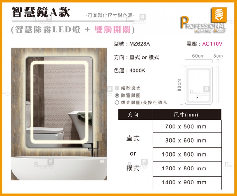 *訂製無框款鏡燈尺寸/色溫約20天-30天