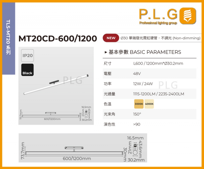 MT20CD-600/1200 磁吸軌道 (Φ30單端發光霓虹軟管)