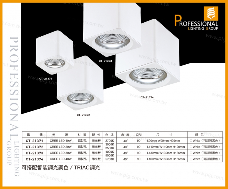 CT-21371、CT-21372、CT-21373、CT-21374 吸頂燈 CT-21371 光源:CREE LED 10W 尺寸:L90mm W90mm H90mm CT-21372 光源:CREE LED 20W 尺寸:L110mm W110mm H120mm CT-21373 光源:CREE LED 30W 尺寸:L130mm W130mm H135mm CT-21374 光源:CREE LED 40W 尺寸:L160mm W160mm H165mm 材質:鋁製品 配件:導光板 色溫:2700K/3000K/3500K/4000K/5000K/5700K 角度:40° CRI:90 顏色:White(可訂製黑色) |